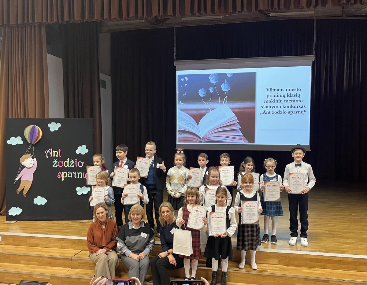 Mūsų mokyklos 2 kl. mokinė ir 4 kl. mokinys dalyvavo Vilniaus miesto 1-4 kl. mokinių meninio skaitymo konkurse ,,Ant žodžio sparnų“ kurį organizavo Vilniaus miesto savivaldybės administracijos Bendrojo ugdymo skyrius ir Vilniaus miesto pradinių klasių mokytojų metodinis būrelis. Mokiniai buvo apdovanoti diplomais ir dovanomis .